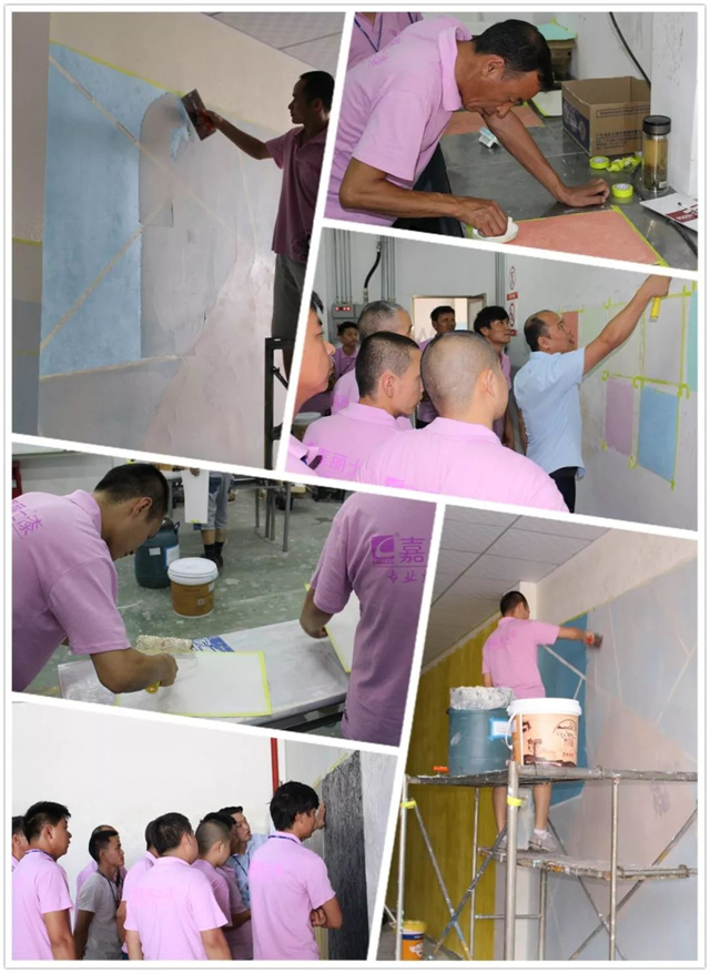 本次培訓,嘉麗士針對各個系列的藝術漆產品作深入的施工培訓,引導經銷商正確認識我司產品及施工方法。他們不僅制作了各系列藝術漆效果的小樣板,還直接上墻施工,真正的體驗產品在墻面上的效果呈現。