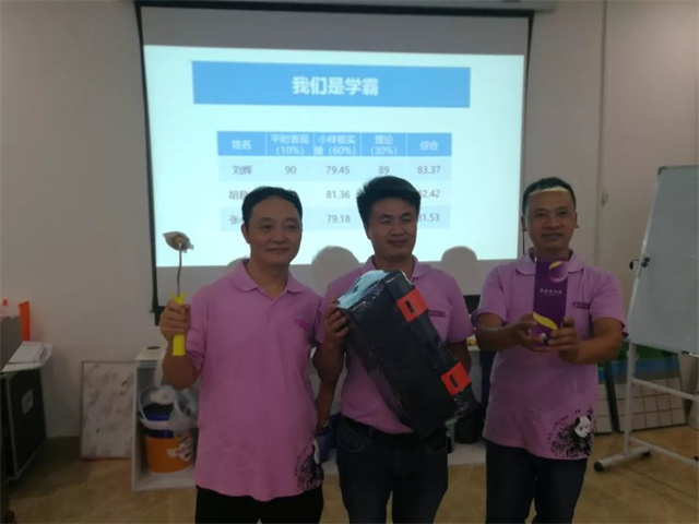 同時,培訓會中還有回顧分享環節,完成實操作品后,可讓學員進行自我評評、與其它學員相互評價,還有老師進行點評指導,指出涂刷注意事項及給出一些建議,旨在讓各位油木工師傅不僅能夠會做,還要學得明白;將藝術漆的涂刷效果更好地呈現給消費者。