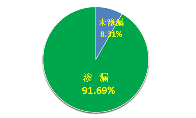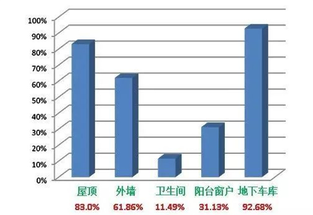 調查的822戶中,750戶滲漏(屋頂、外墻、陽臺、窗戶、衛生間中任意部位)。▼住宅不同部位的滲漏率:屋頂83%,外墻61.86%,衛生間11.49%,陽臺、窗戶31.13%,地下車庫92.68%