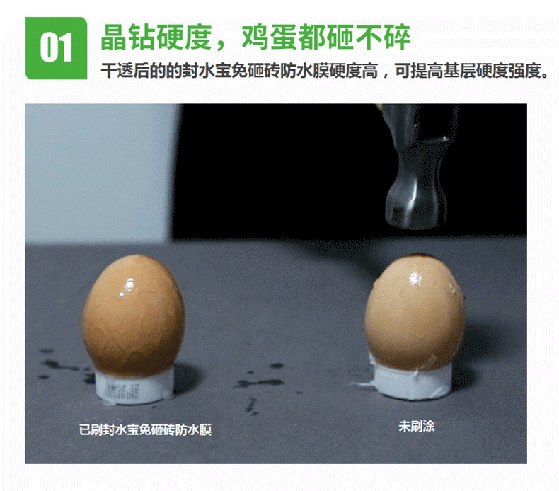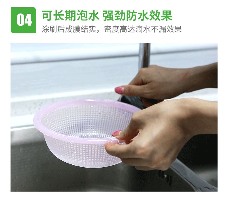 封水寶免砸磚強效耐候防水膜,是以優質天冬聚脲樹脂、精選助劑、顏填料、固化劑為改性異氰酸脂組成的雙組份產品,混合后產生交聯反應形成高分子透明防水膜,適用于屋頂,水池、廚房、衛生間瓷磚表面滲水修復、內墻表面防水防潮處理,讓你重做防水不砸磚,省時、省工更省錢。