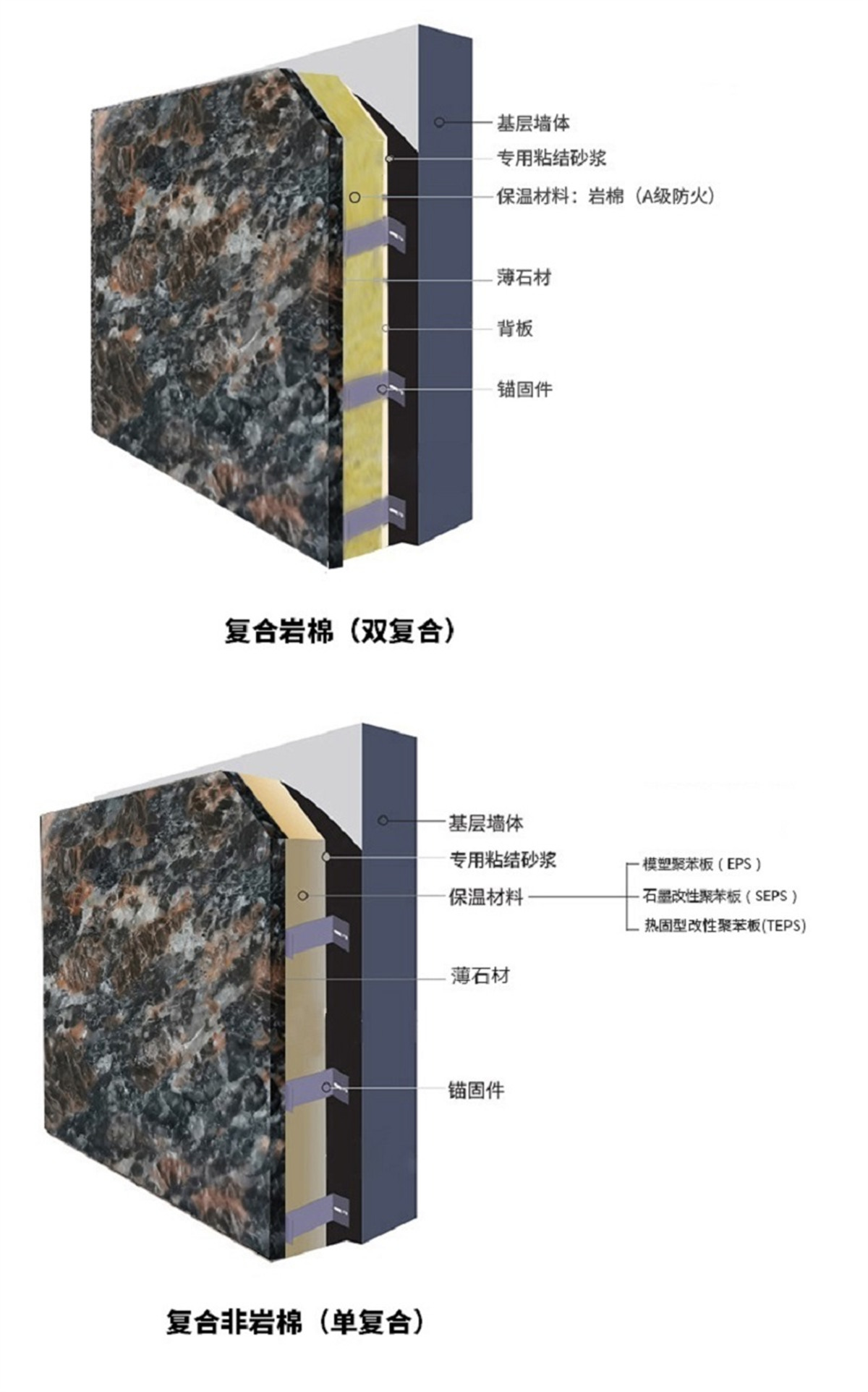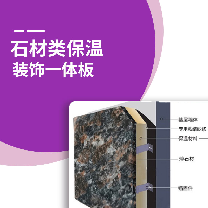 薄石材保溫裝飾一體板是采用天然石材與保溫材料復合而成的保溫裝飾一體板,其裝飾效果更高檔、華麗。相比干掛石材,其在達到同等裝飾效果的情況下,造價成本更低、施工更便捷。常用薄石材類型有卡麥、皇室棕、芝麻白等。