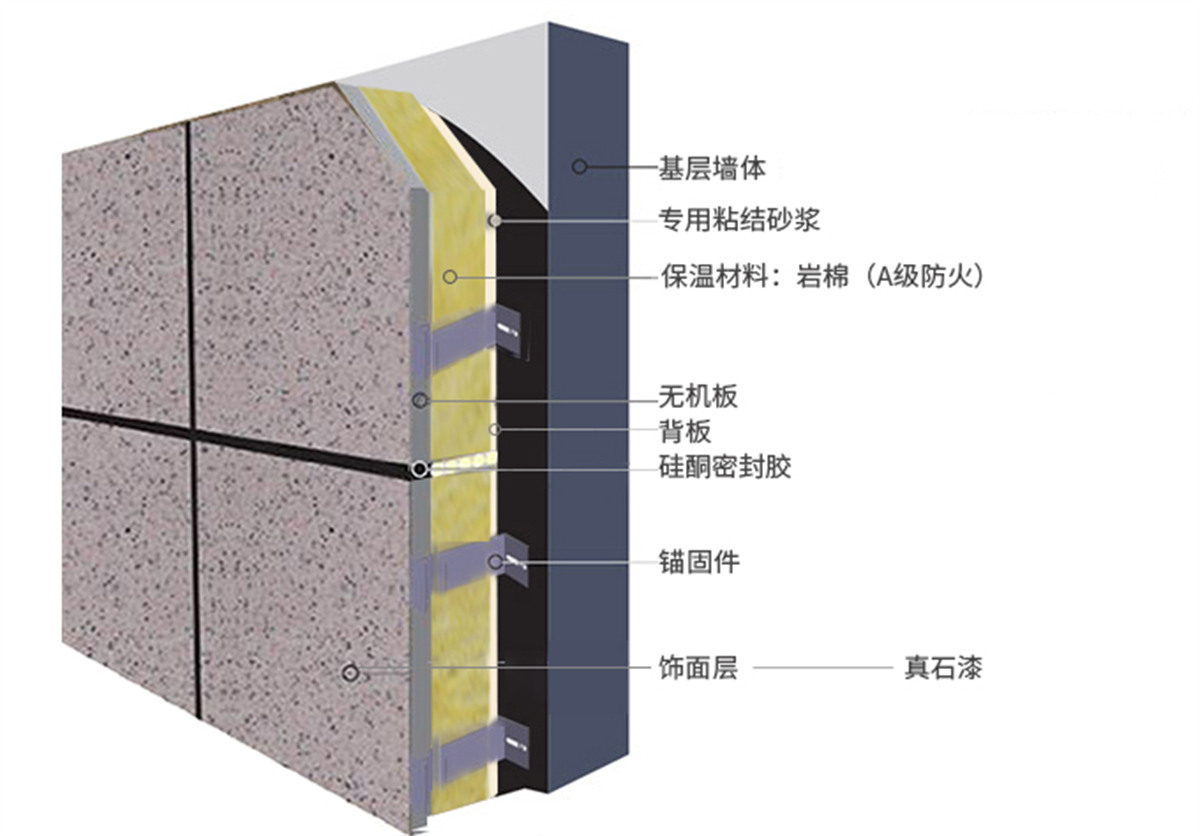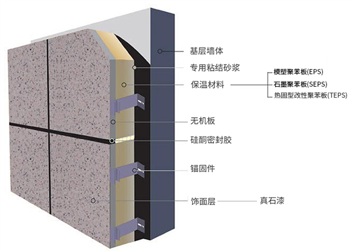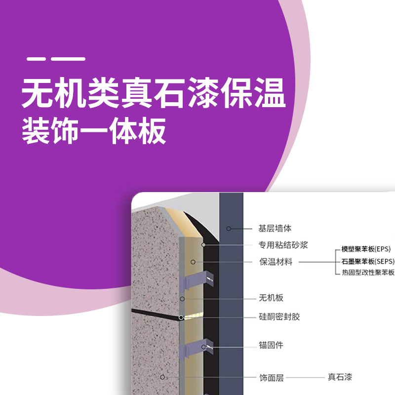 真石漆保溫裝飾一體板選用高密度、高強度A1級無機板為基材,通過精砂、滲透封閉、界面處理、飾面噴涂(輥涂)、固化、養護、復合等多道現代化生產工序加工成型。真石漆飾面表面層厚實,具有真實的自然色澤、質感,給人以高雅、和諧、莊重之美感。